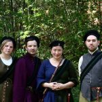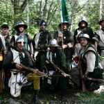 Två granländska soldater, en måslänning i granländsk tjänst (notera sjalen runt halsen) samt en väbel.